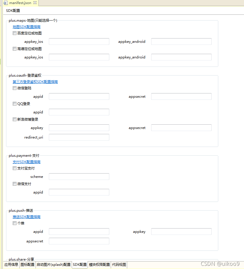 SDK配置主要与引用第三方插件时需要填写的信息相关。开发过程中,有些插件需要输入自己的ak和sk。需要特别注意的是,相关使用细节必须查阅第三方sdk文档。不同功能的插件操作方法不同。比如,在登录、支付、推送、分享等常用功能插件中,登录插件可能需要在确保数据安全的前提下,与用户账号体系进行对接。