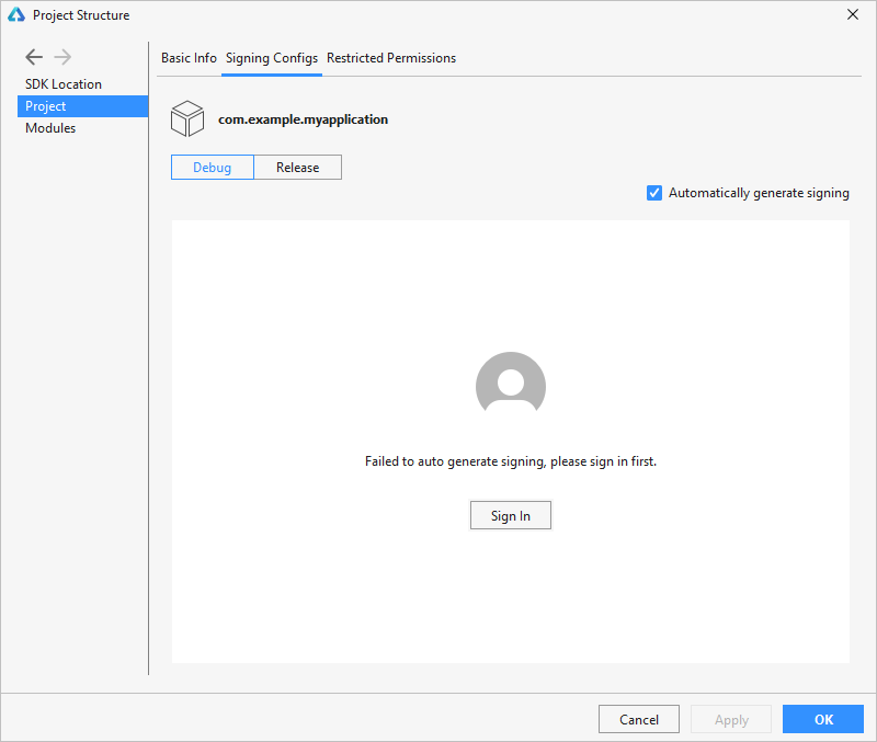 ohos { ... //配置签名信息索引 signingConfigs { debug { storeFile file(signingConfigProps['storeFile']) storePassword signingConfigProps['storePassword'] keyAlias signingConfigProps['keyAlias'] keyPassword signingConfigProps['keyPassword'] signAlg = 'SHA256withECDSA' profile file(signingConfigProps['profile']) certpath file(signingConfigProps['certpath']) } }
