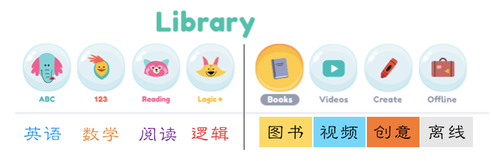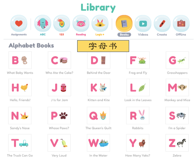 图书馆的资源分类方式非常明确,这是一个很大的优势。当孩子在学习字母时遇到难题,家长或老师可以迅速找到所有与字母相关的资料,包括视频和电子书等。这种分类模式细分到故事、字母等多个类别,多达十几项,便于根据孩子的具体问题进行针对性的辅导。