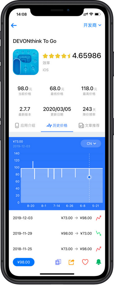 过去AppStore上有很多应用可以查看价格变动。其中,PriceTag颇受欢迎。它能够跟踪应用降价信息,并能查看价格的历史走势。此外,还有专门的文章介绍这些应用。这让用户对应用有了更全面的了解。但PriceTag逐渐出现了问题。一旦下架,用户在已购列表中下载时会出现闪退,给用户带来了很多不便。而且,iOS用户无法访问微信小程序,导致许多习惯使用它的用户不得不寻找替代方案。