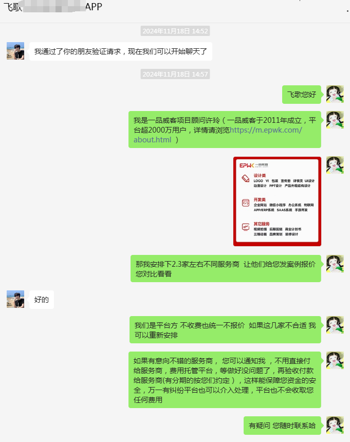 飞歌的项目一期进展顺利,二期合作也在稳步进行。对汇世纪网络科技提供的服务,飞歌表示满意,并希望继续携手。他坚信,有了他们的支持,交友软件将吸引更多用户。此外,飞歌也对一品威客平台表示感谢。毕竟,对企业而言,项目开发成本高、周期长,选择外包公司需谨慎。而一品威客能迅速找到实力强的合作伙伴,并提供资金支持。同时,平台在促进创意交易双方沟通方面也发挥着重要作用。