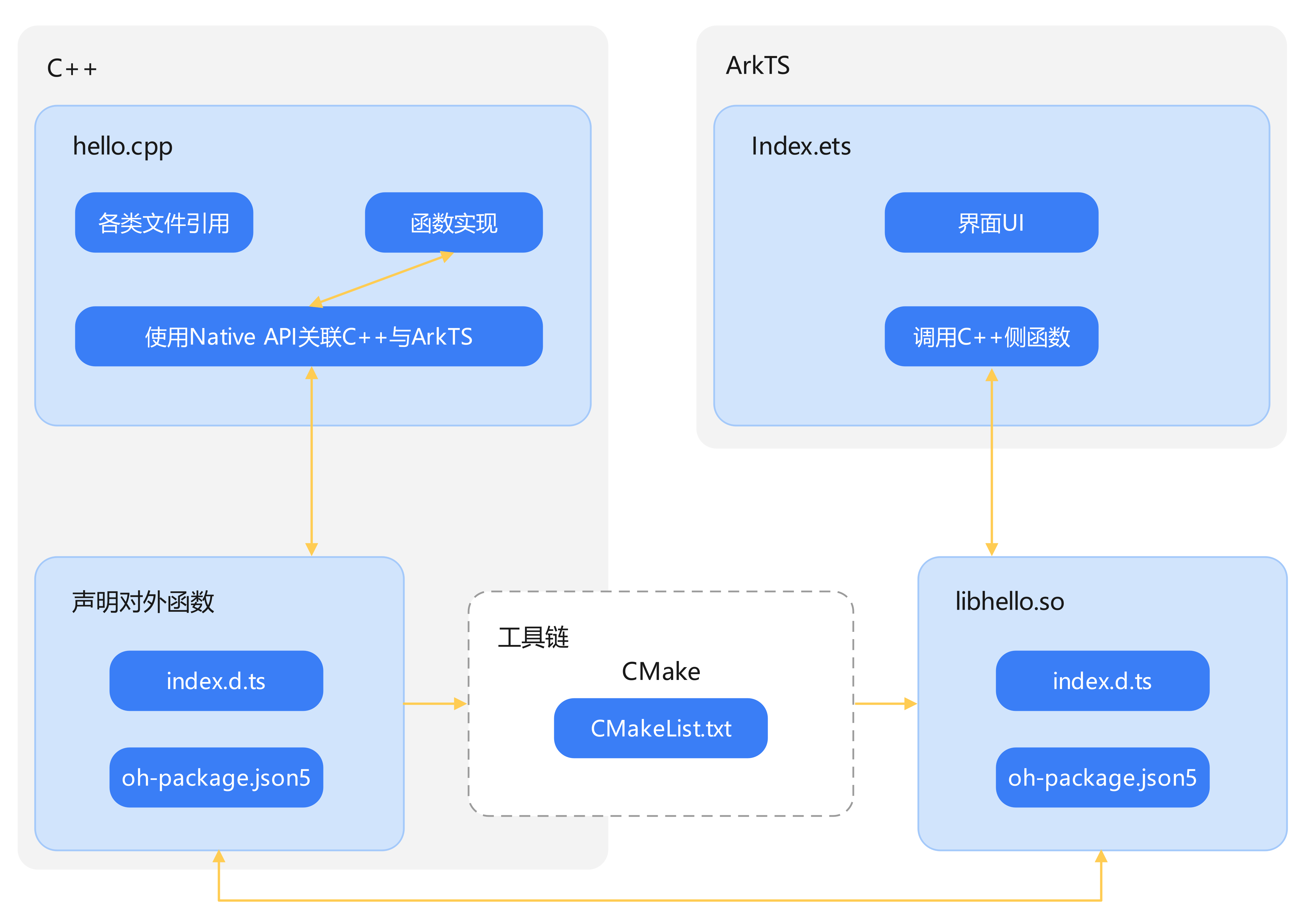 整个项目的核心结构是应用架构,它由三部分组成:C++、ArkTS和工具链。理解这三部分的功能及其相互关系至关重要。以ArkTS调用C++方法为例,并非直接调用。这里NAPI、CMake等工具起到桥梁作用,就像外交官在不同国家间沟通协调。没有这些工具,交互难以顺畅。各部分间的关联关系有明确的图示,对开发者而言,就像有航海图指引,能避免迷失方向。C++代码由CMake编译成动态链接库so文件,index.d.ts文件负责提供接口,这一系列步骤确保了不同部分间信息交流和功能调用的顺利进行。