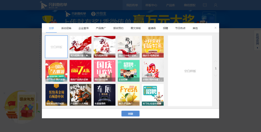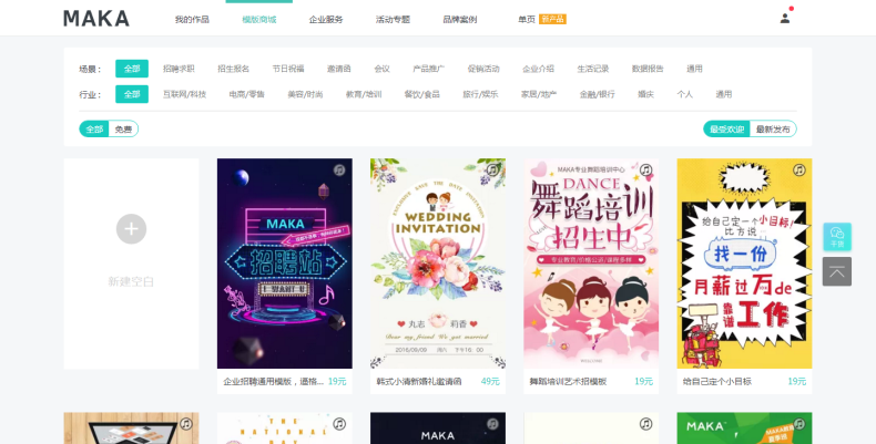 凡科在界面设计上做得很美观且大方。新手进入新建作品后,会自动弹出许多可供选择的模板。这些模板紧跟潮流趋势,无论是色彩的搭配,还是板块的设计,都能够满足用户的时尚需求。并且,大部分模板是免费的。对于那些没有太多预算,却想要尝试制作 H5 的新手而言,这是很有吸引力的。