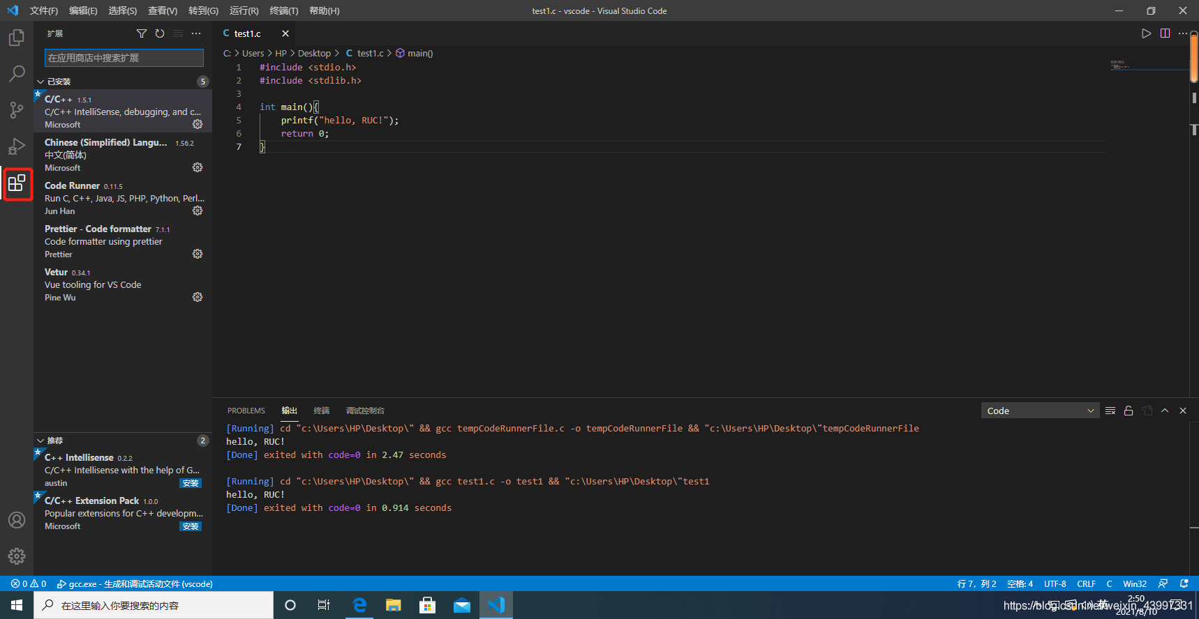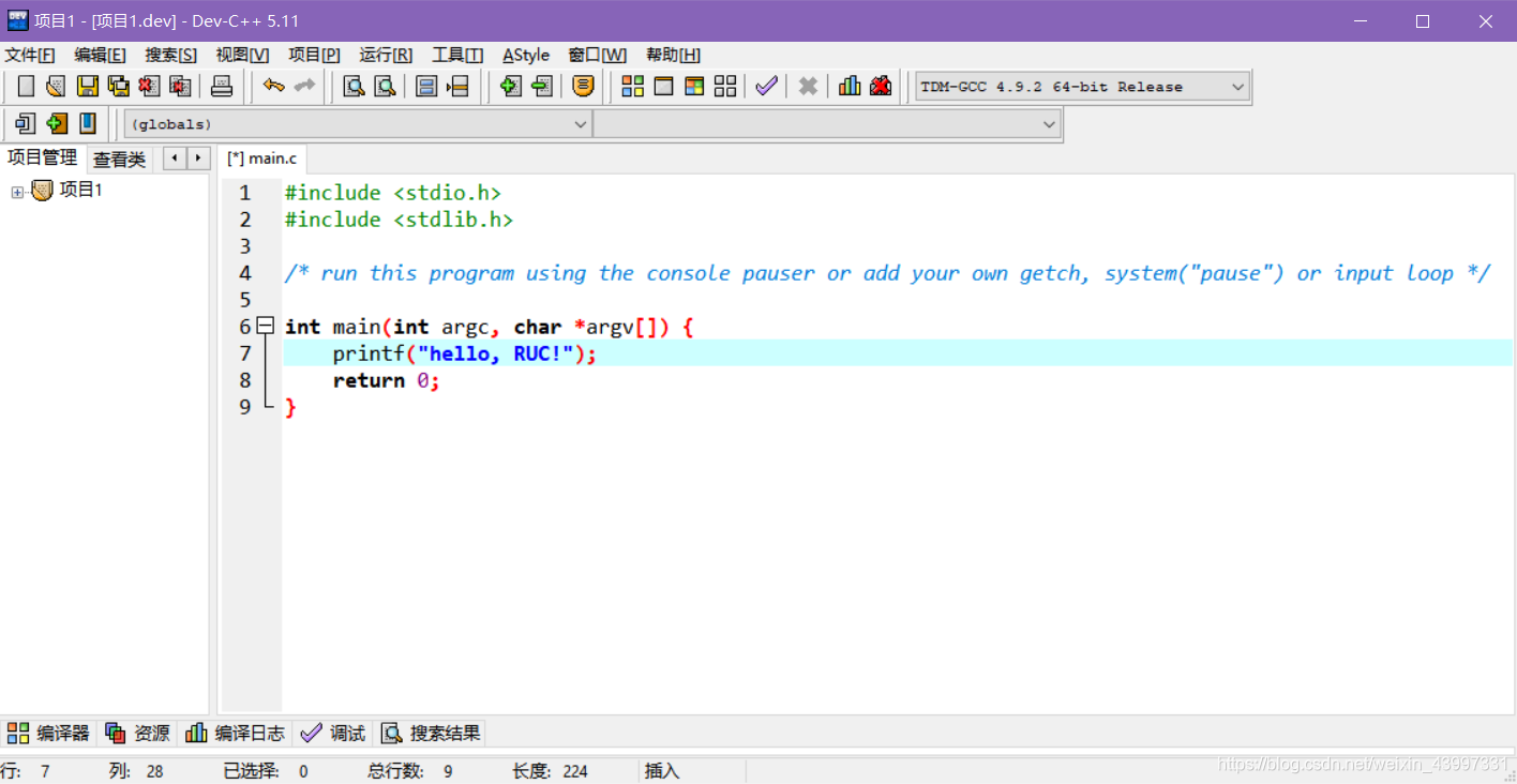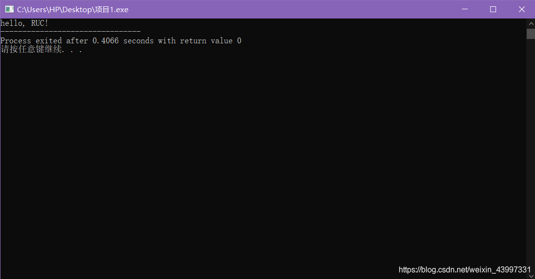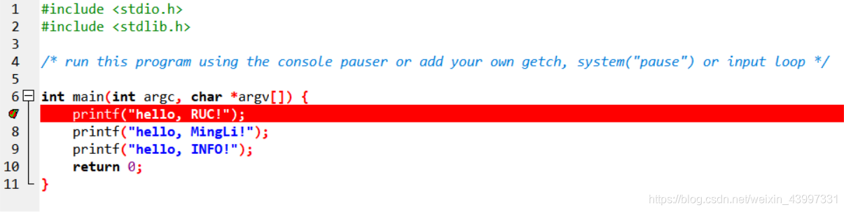printf(\"hello, RUC!\");