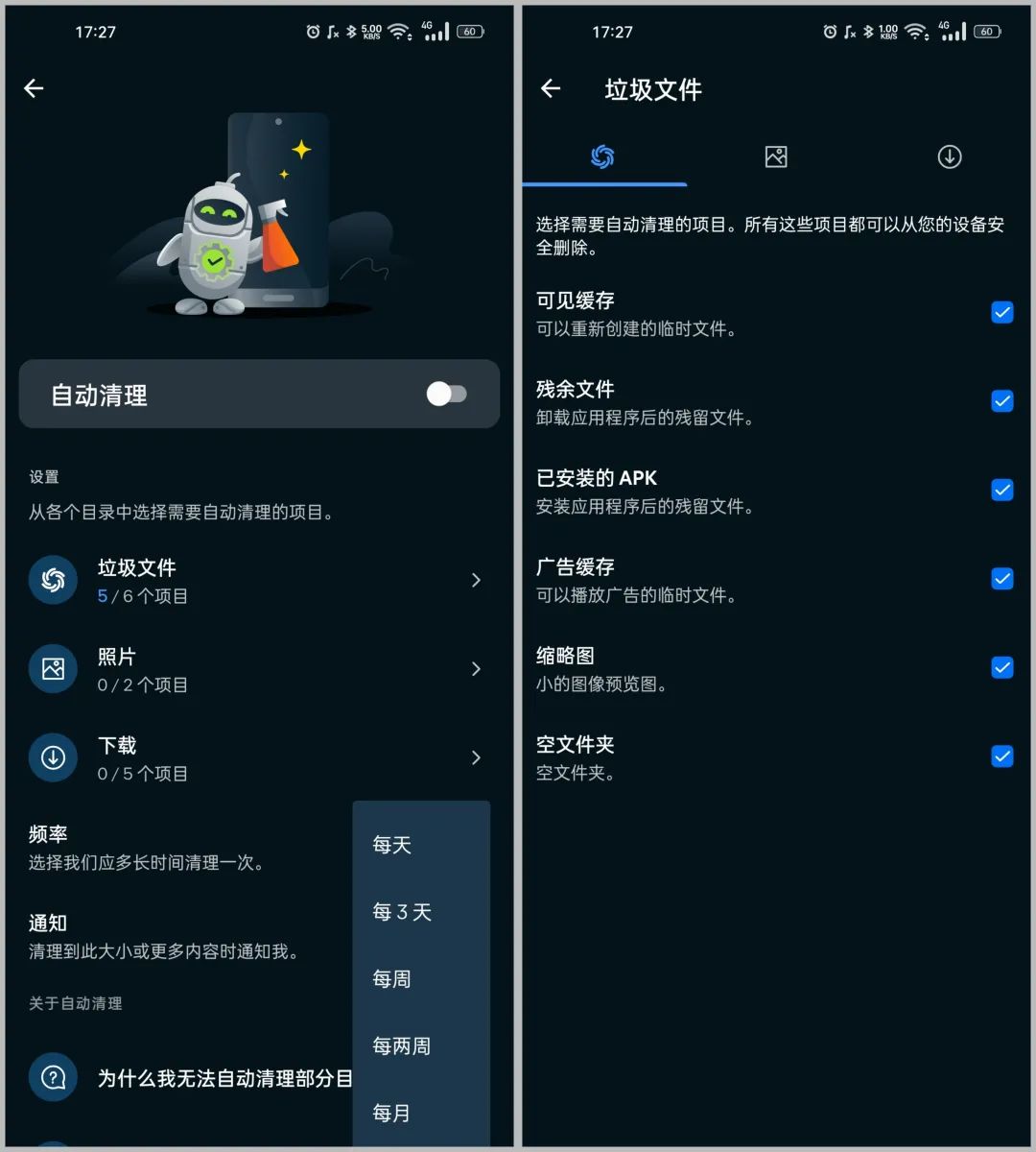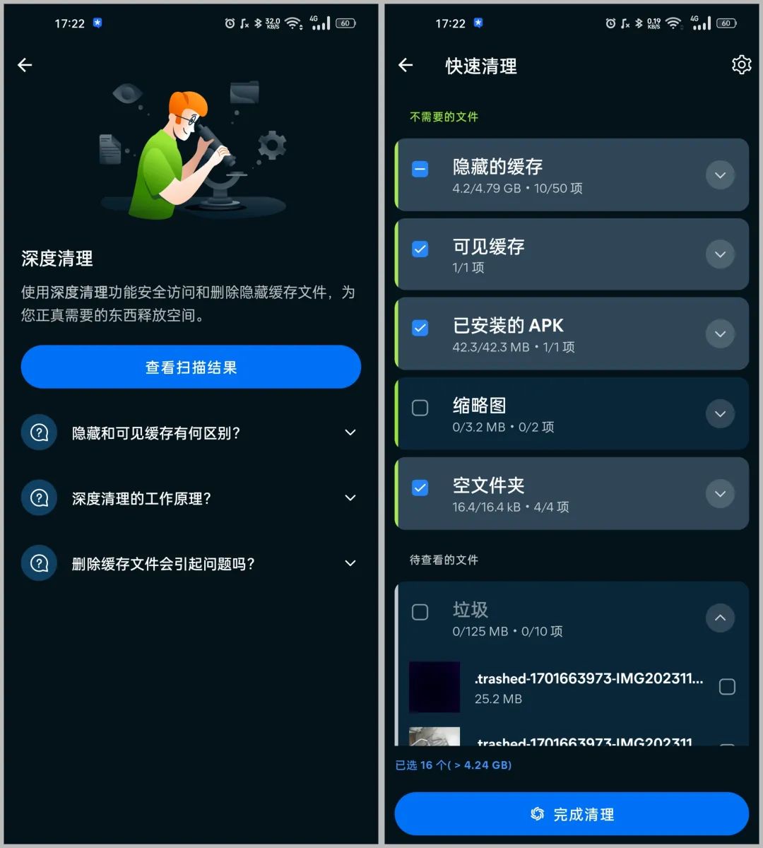 Avast 实现了很多清理效果。比如,对于那些长时间使用手机、空间近乎满负荷的用户,Avast 能够快速检测各种类型的文件,接着分析哪些文件可以安全清理以释放内存。