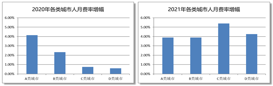 近五年来,开发生产效率的数据保持稳定,但各领域表现不尽相同。金融、电信和制造等行业生产效率稳步上升,而其他行业则相对稳定,这种差异是由各行业的发展特性所决定的。在成本方面,人月费用在过去五年内持续增长,A类城市的平均基准人月费用为3.05万元,而北京则高达3.09万元。这一现象显示了行业人才成本上升的趋势。