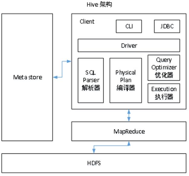 Hive系统由三个主要部分构成。首先是客户端,Hive支持多种驱动程序,以便与不同应用协同工作,比如与Java应用配合时,会使用Java客户端。接着是服务部分,这部分需要与执行客户端进行交互,例如,客户端执行查询时,必须与Hive服务进行沟通。最后是存储与计算部分,数据存储依赖于HDFS,而数据计算则依赖于其他相关组件。