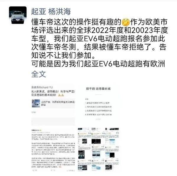 懂车帝冬季测试中的品牌合作等级设定引起了争议。起亚公司的首席运营官杨洪海表示,懂车帝拒绝让起亚EV6车型参与这项测试。在汽车行业里,评测机构发布的评测结果对车辆的销售有着极大的影响。对于汽车品牌而言,参与评测是提升品牌知名度和市场认可度的重要途径。评测规则若不统一或有偏颇,可能会破坏市场的公平竞争环境。那么,汽车企业在评测中的参与权益究竟该如何得到保障,这确实是一个值得深思的问题。从消费者的角度来看,评测的公正性直接关系到他们的购车选择。