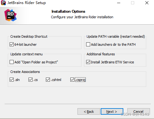 启动指定版本的Rider.exe,接着指定安装路径,然后继续进行安装步骤。在安装时,根据提示选择相应的选项,这些选项的不同选择会影响最终的配置效果。