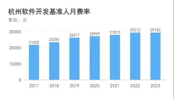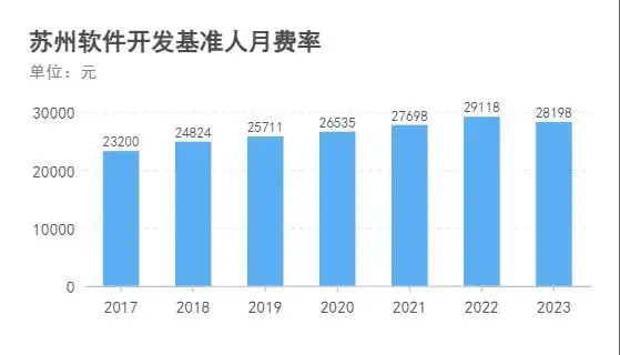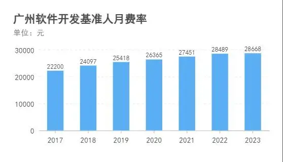 杭州与广州的进步引人注目。2017年,广州一度领先杭州,然而2019年杭州实现逆袭,持续领跑至今。截至2023年,杭州的经济发展已接近三万元大关。尽管南京和苏州并未被详细提及,但它们的发展轨迹同样清晰。这些城市的经济繁荣推动了软件产业的进步,进而影响了人月费用的调整。