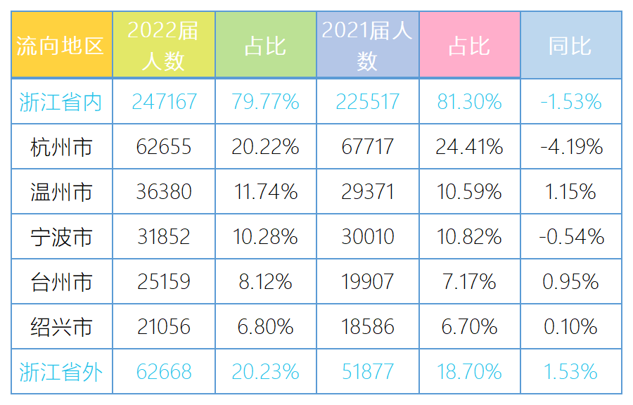 2022年,我们省的毕业生中,有79.77%选择在本省工作。其中,约42.24%的人聚集在杭州、宁波和温州。这些城市各有特色,经济和文化都很有吸引力。杭州是互联网等新兴产业的热门聚集地,企业众多,就业机会丰富。宁波的制造业十分兴旺,提供了众多制造业岗位。温州则商业气息浓厚,非常适合商科等专业毕业生的发展。