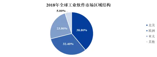 从2014年到2020年,全球工业软件市场的增长速度超过了5%,而且这一增速近年来有所提升。在这段时间里,市场规模一直在增长,反映出对工业数字化的高度需求。全球各地区的发展并不均衡。欧美等发达国家凭借其工业化的历史优势,在高端工业软件领域处于领先地位。到了2018年,欧美区域在全球市场中的份额超过了50%,其中北美占据了38.80%,欧洲则占32.40%。这种情况说明,其他地区若想在工业软件领域取得一席之地,将会遇到很大的挑战。