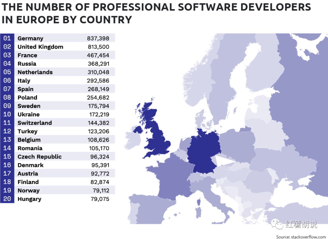 数据显示,2016年欧洲软件开发者约有470万,2018年这一数字增至550万。英法两国软件开发商数量领先,英国达81.3万,法国46.7万。在东欧,乌克兰是重要的人才库,其软件开发者人数持续增长,目前统计已有18.47万名IT人才。