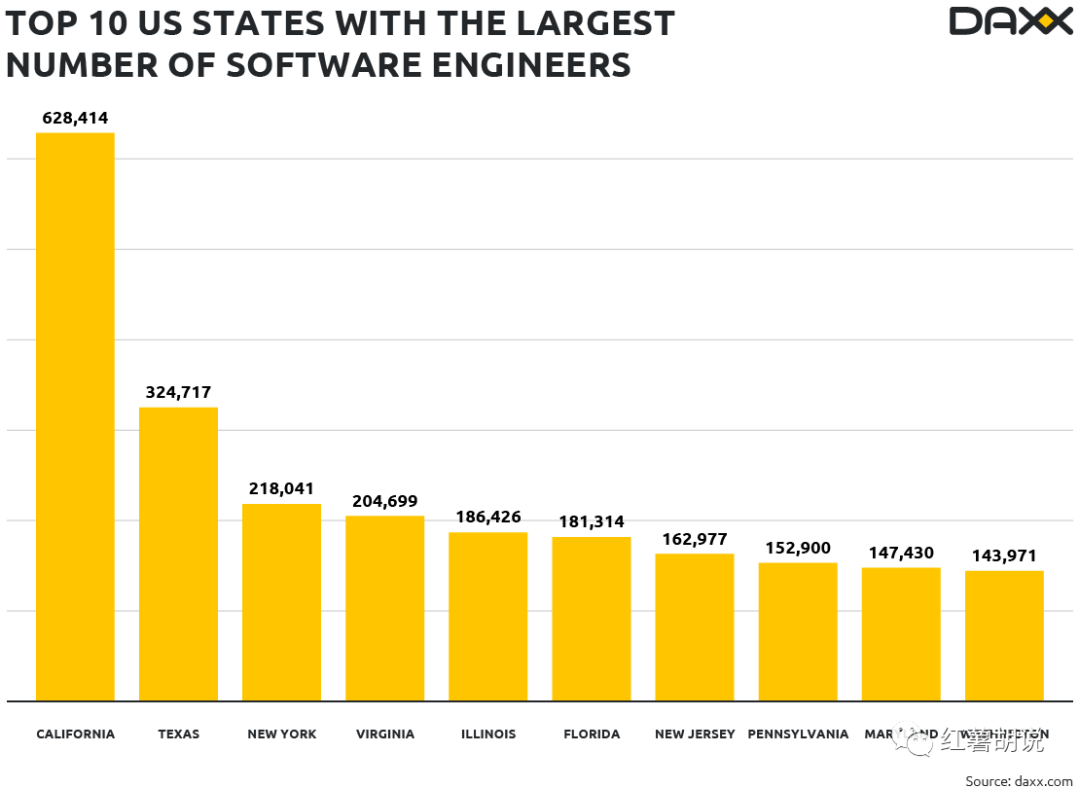 加州集中了大约六十二万八千人,他们是被称为开发人员的专业人才,这一数量在软件开发领域显得尤为显著。在美国,从事软件开发的人数众多,并且这个数字还在不断增加。由于科技产业的繁荣,这里的软件开发人员有着极为宽广的职业发展空间。