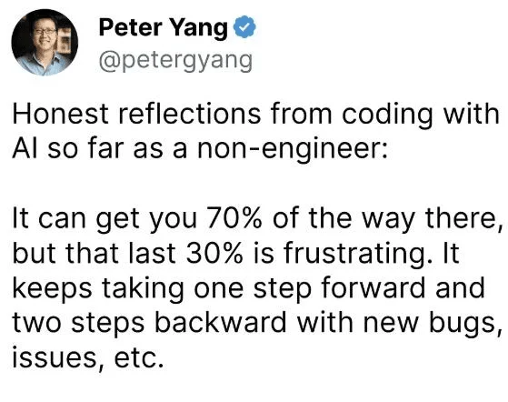 “70%的难题”揭示了人工智能辅助开发的实际情况,起初进展顺利,然而随后问题频发。众多实际项目中,初期借助AI进展迅猛,但后期却遭遇众多棘手的bug。这表明AI目前尚不能彻底解决开发过程中的所有问题。