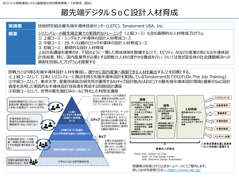 这次委托的培训项目是NEDO“第五代信息和通信系统基础设施研发项目/人才培养/顶尖半导体设计人才培养”计划的一部分。该项目由LSTC等机构共同负责实施。这反映出日本在半导体人才培养方面付出了极大的努力。其目的是通过利用外部资源,提升本国芯片设计的竞争力。
