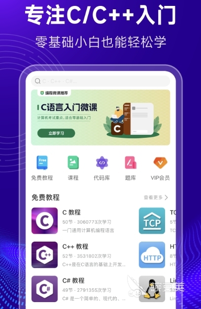 《菜鸟学C语言》这款APP专为学习C语言设计。其中包含了大量课程和练习题,适用于不同层次的学习者。初学者可以借助这些基础课程迅速上手;而对于已有一定基础的学习者,通过练习题可以加深对知识的理解。