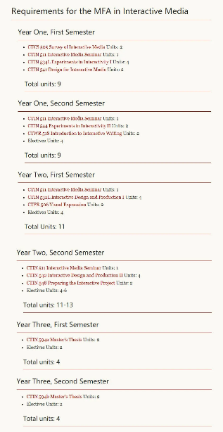 游戏中心开设的课程集中在游戏行业,特别注重游戏在艺术方面的表现。其中,“Game”这门课程会教授两种工具,并设定主题,引导学生自行分组,设计游戏,一个学期内要完成三四款。选这门课的学生一般需要拥有计算机科学学士学位,并有一定的游戏开发经验。