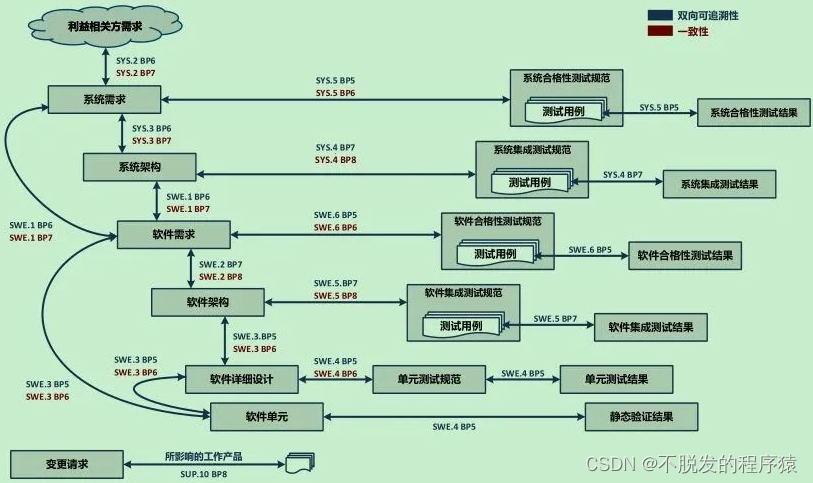 需确保软件架构的设计要素与测试案例之间能够相互追踪。换句话说,测试案例能指向设计要素,反过来同样可行。以某车型的软件为例,若在测试中发现了问题,便可通过追溯确定是哪个设计环节出了问题,便于快速处理。