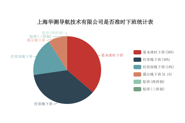 该公司加班现象比较严重。根据数据统计,多数人在下班时间上较为规律,其中(36%)的人能够准时离开,(9%)的人偶尔会晚些下班,(36%)的人则经常晚归,更有(18%)的人常常很晚才下班。至于周末加班情况,(27%)的人周六会频繁加班,(18%)的人周六周日都会加班,(36%)的人偶尔在周末加班,而(18%)的人则周末两天都不加班。