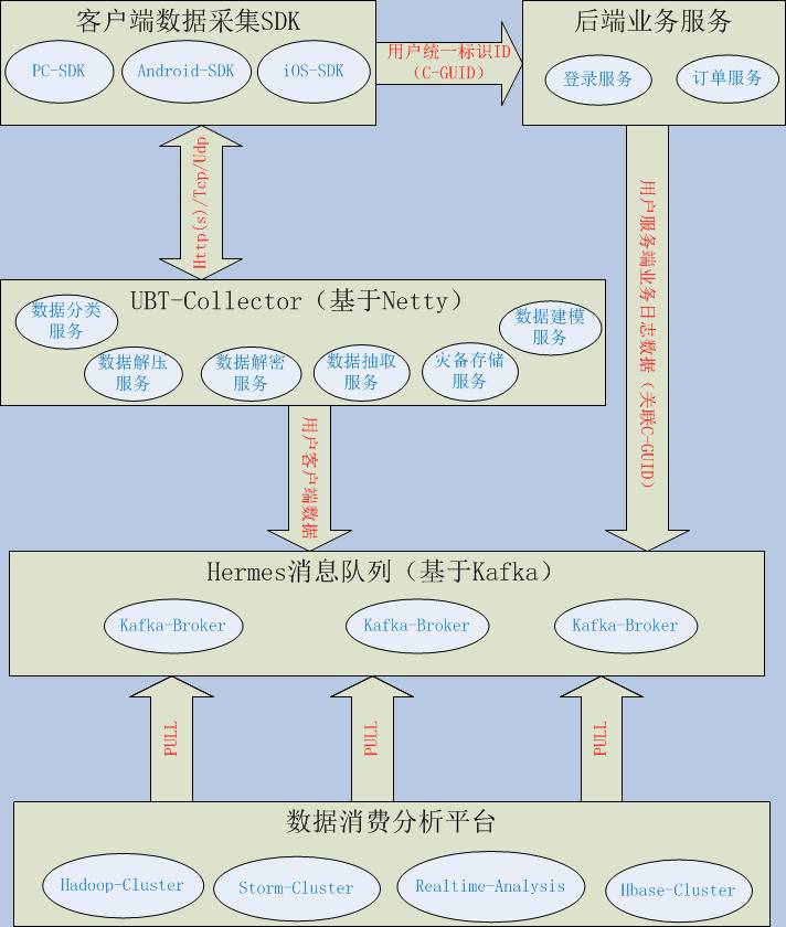 在平台系统中,客户端的数据采集SDK起着至关重要的作用。该SDK能够适应各种网络状况,并利用Http(s)/Tcp/Udp等协议,按照既定策略将数据传输至(UBT-)服务器。业务服务器负责记录关联用户的操作数据和日志,收集客户端SDK生成的用户唯一标识(C-GUID),然后将用户的操作数据和日志信息以非同步方式存入(Kafka)队列中。