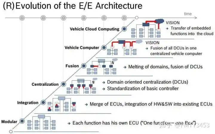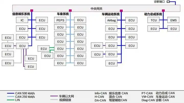 在通讯行业中,HCU 与其他控制器利用 CAN 协议进行信息交换。整个车辆系统被划分成若干个 CAN 子网络,这些子网络通过网关实现互联互通。随着汽车技术的持续进步,未来的通信架构正逐步朝着减少控制器和域控制器的使用方向演变,以应对通信信息量和实时性要求的提高。