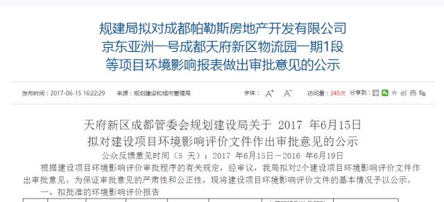 5月25日,京东在成都天府新区的一号物流园一期Ⅰ段项目发布了环境评估公告,这标志着该公司的首个仓储物流中心即将动工。在此之前,京东特意设立了成都帕勒斯房地产开发公司,并投入了2.3亿元资金用于建设标准化的仓储物流设施。自2016年11月在成都天府新区设立公司以来,京东的业务持续扩张。
