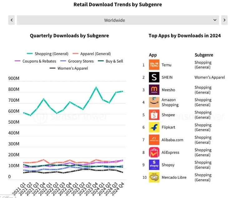 近期,Tower发布的《2025年移动市场报告》揭示,2024年,拼多多海外版Temu下载量位居全球之首,成为最受欢迎的购物软件。这一成绩彰显了拼多多在海外市场的拓展成效显著,迅速登陆国际舞台,吸引了众多海外用户。同时,这也为国内商家带来了更多商机,让他们得以将商品推向全球市场。