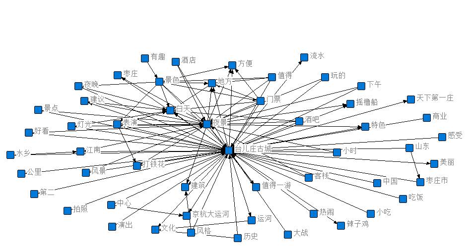 经过对网络关系图的细致分析,我们注意到“台儿庄古城”处在最核心的第一层,成为游客关注的中心。随后,我们发现“夜景”占据了第二层核心位置,它是吸引游客的重要因素。这一现象也反映出,发展夜间经济是该地区的一大特色和优势。向外扩展,第三层外围区域涵盖了诸如“建筑”和“酒吧”等元素,这些元素是吸引游客的重要因素。同时,“值得”和“方便”等词语则关联到旅游体验。台儿庄古城与当地、运河、历史和文化紧密相连,凸显了文化是其核心的吸引力所在。