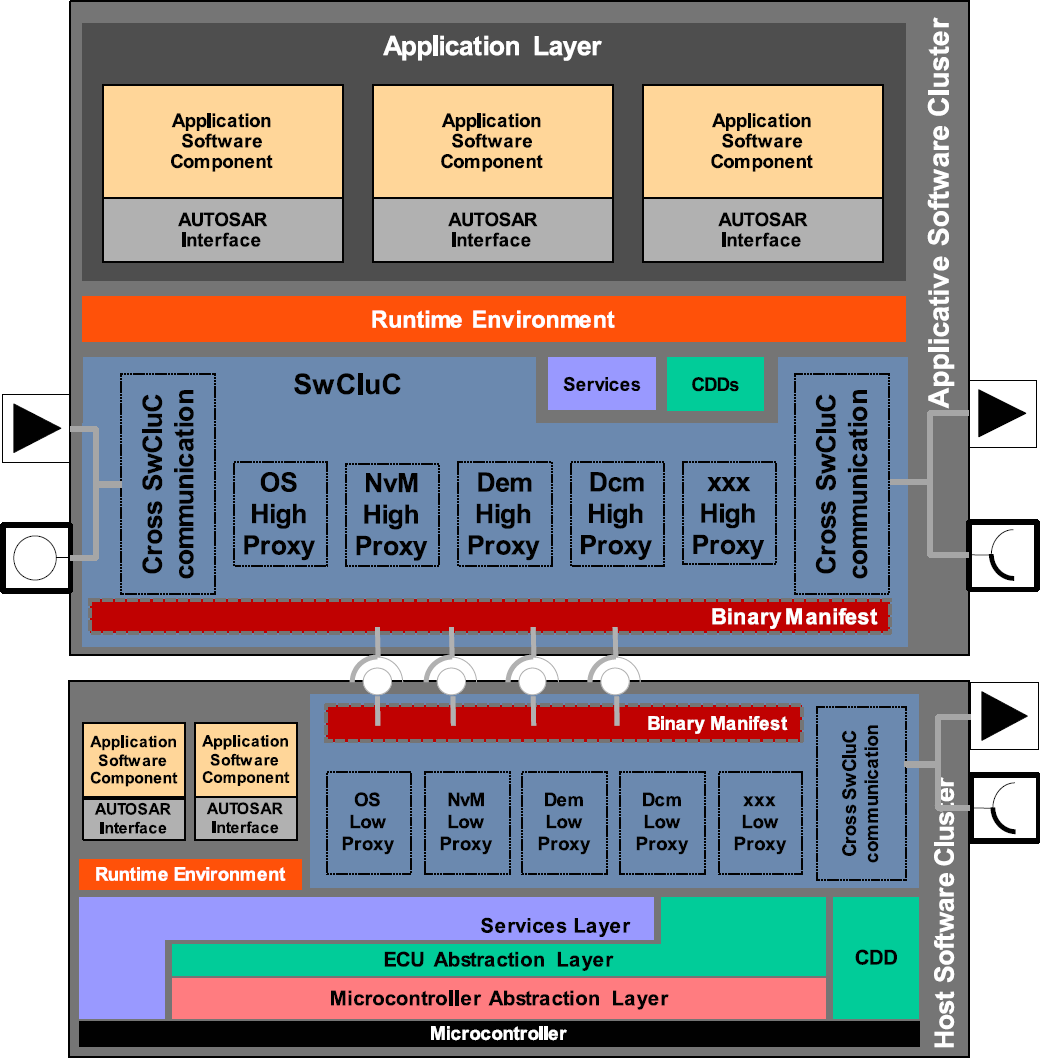 运行时环境(RTE)作为应用软件与基础软件之间的连接纽带,实现了软硬件的分离。它将基础软件层的服务进行了封装,并提供了标准化的接口。应用层可以通过RTE的接口来调用这些基础服务,这样就相当于在两层之间建立了一条快捷通道,使得软件组件对底层服务的调用变得更加方便。