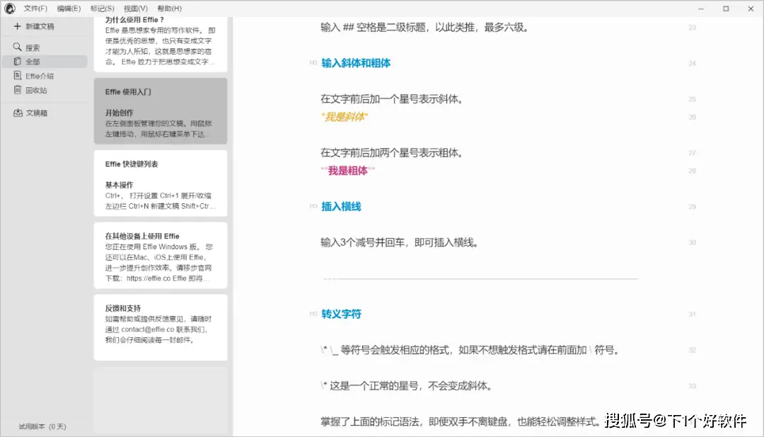 启动“Effie”程序,界面设计简洁,专为写作而设,没有繁杂的功能。官方介绍称,它能帮助用户全情投入创作,专注其中,四周一片宁静。文本编辑方式与markdown相似,软件内置了详尽的教程,用户仅需几分钟即可轻松学会。运用这种方法,写作效率明显提高。多种样式配置通过键盘轻松完成,不必频繁触摸鼠标。而且,文本段落和节点可以轻松转化为思维导图。只需双击思维导图内容,即可进行编辑。系统内置了五种样式,可以随意切换,和幕布功能类似,无需额外安装思维导图软件。