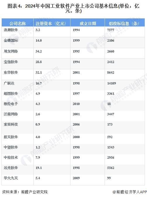在注册资本这一项,用友网络位居首位。浪潮软件和宝信软件在成立时间上,都是资历较深的企业。至于招投标信息,广联达的数量最多。在专利方面,金蝶国际表现抢眼,拥有1712条专利,其中发明公布和发明授权是专利的主要形式。