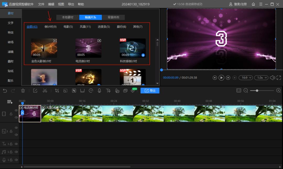 只需启动软件,上传准备好的素材。然后,点击界面左侧的“素材库”,那里聚集了多种创意十足的倒计时片头素材。挑选合适的素材,将其拖至视频轨道的正确位置,视频便会立刻呈现出专业的开头效果。