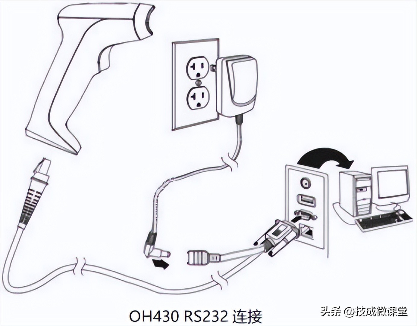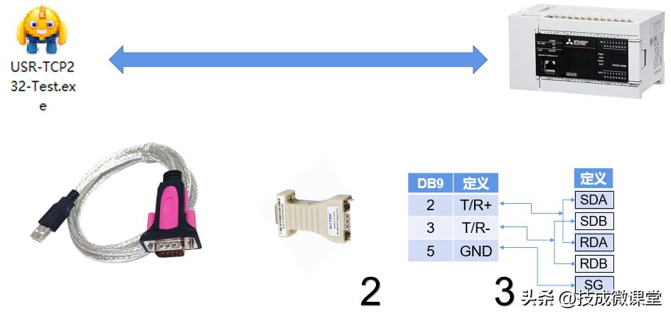本案例中,扫码枪主体设计为网口型,附赠一条RJ45转RS232的通讯线。FX5U设备具备485接口,电脑则采用USB接口。它们之间可借助两种连接方式:其一,利用USB转RS485通信线实现连接。