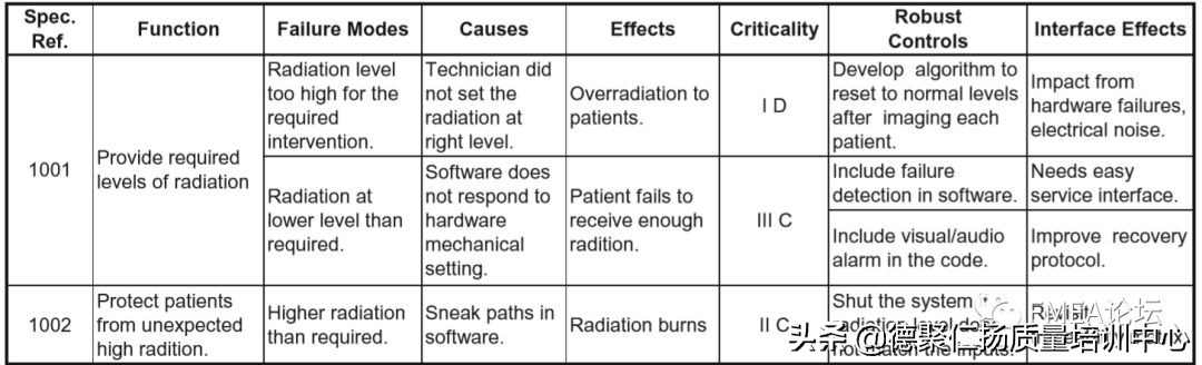 系统级软件FMEAs需对比故障模式对软件输出的作用,与软件危险分析得出结论相对照。而详尽的软件FMEAs需将假设的故障模式影响回溯至“代码及输出信号”,并与详细软件危害进行对比,从而识别出潜在的危险故障。