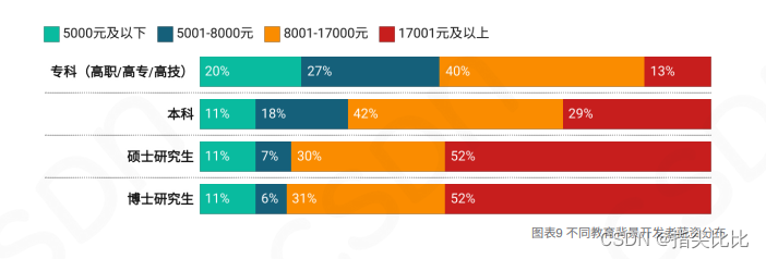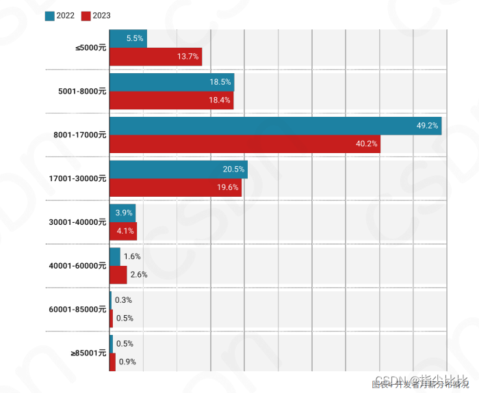 软件行业发展迅猛,我国大约一半的编程人员活跃在此领域。尤其是后端开发岗位,开发者人数尤为众多。观察收入状况,月收入介于8000至17000元之间的开发者比例,较上年同期下降了9个百分点,从49.2%下降至40.2%。这种变化或许与行业竞争的加剧以及经济环境的变化有关。对于一些规模较小的互联网初创公司,资金问题导致它们可能难以继续提供以往那么优厚的薪资待遇给开发者。