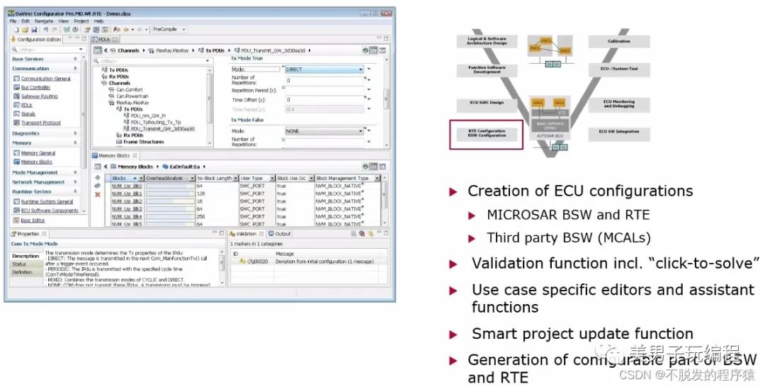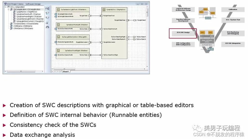 该公司开发的这款工具用于设计ECUS软件单元(SWC)的图形配置,它是一种符合标准的软件配置工具。此工具的主要功能是进行配置并生成ECU中的基础软件(BSW)。