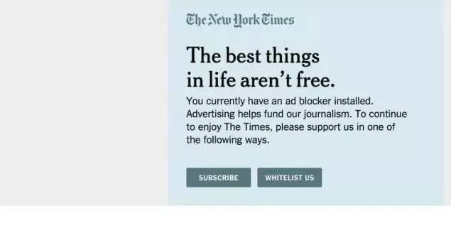 近期,《纽约时报》也加入了呼吁用户关闭广告拦截器的行列。对于已安装拦截软件的读者,他们提供了两种方案:一是选择付费订阅,二是将网站加入白名单以便继续浏览广告。同时,弹窗提示中还强调,“世间诸多美好,大多不免费”。