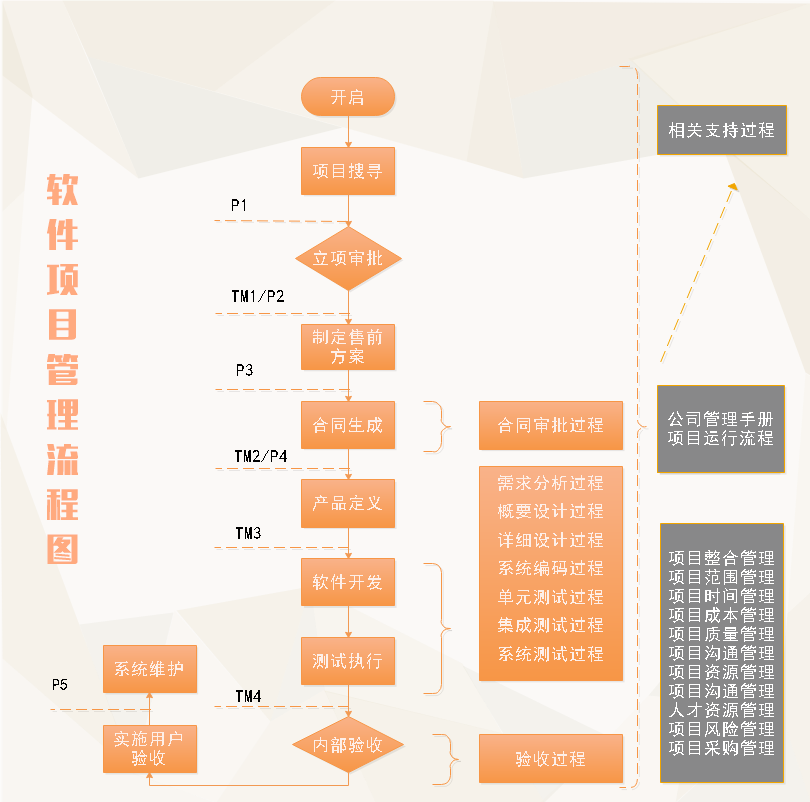 软件项目的整体设计流程包括五个阶段:启动、规划、执行、结束以及后期维护(P1至P5)。在启动阶段之前,必须充分掌握开发公司的定位和长远目标,保证项目能在实际操作中达成。比如,一家初创的软件企业若要启动一个新项目,就需要考虑自身的技术水平和资金状况。