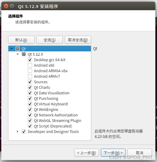 下载完毕后,给文件设置执行权限。使用sudo命令提升权限进行安装,默认安装路径为/opt。安装时挑选所需组件。安装结束后,可在应用程序中心找到Qt,点击打开使用。
