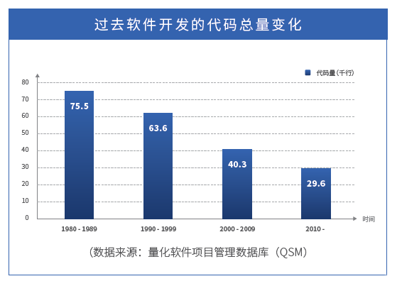 90年代,编程语言的设计理念发生了变化,开始注重提升程序员的工作效率。这一转变催生了众多“快速应用开发”语言。这些语言大多配备了集成开发工具和自动垃圾回收功能,且多数源自于先前语言的演变。同时,敏捷开发等新兴的软件工程方法也应运而生,显著提升了软件开发的速度。以项目周期为基准,原本的周期已从较长的时间缩短到了9.9个月。而且,各个项目的代码量也有所下降,平均每项约为63.6千行。