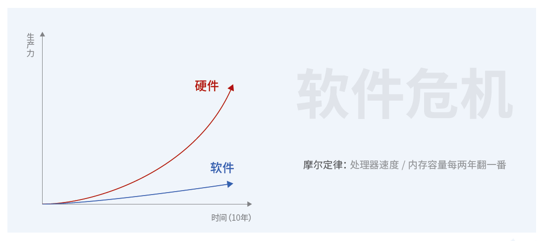 行业深受软件危机的困扰,硬件领域依照摩尔定律迅猛进步,但软件的生产力却未见增长,如何突破这一困境成为了大家关注的中心问题。
