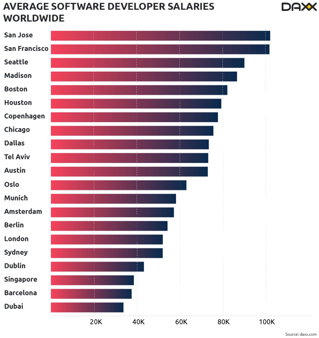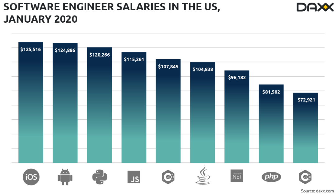 查看2020年的相关资料,我们了解到美国初级开发者的收入大致为六万七千美元。软件行业正快速进步,初级工程师的需求持续增长。为了吸引人才,各国在初级工程师的薪酬方面投入了大量关注和资源。