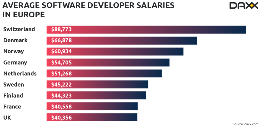 新加入行业的初级软件工程师充满活力,他们所受的待遇备受关注。在瑞士,初级技术人员的薪酬处于较高水平,初级开发者的月薪大约是72k美元,这样的待遇对职场新人来说非常丰厚。美国紧随其后,初级软件开发者的薪资大约是68K美元。