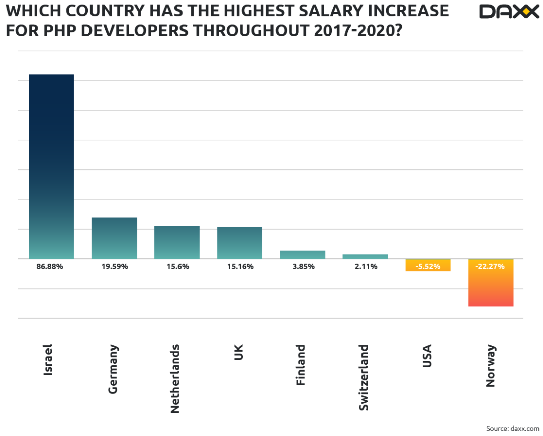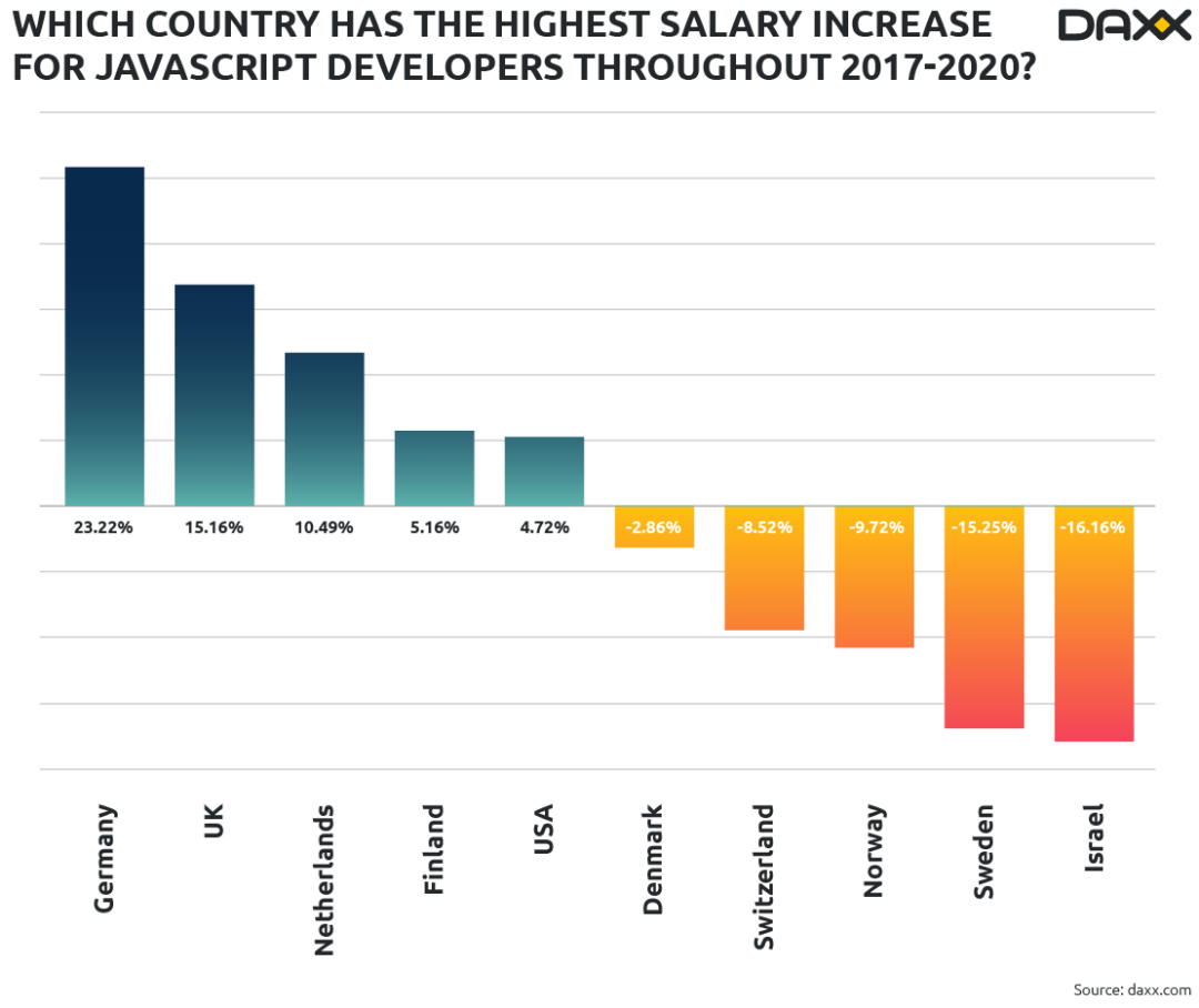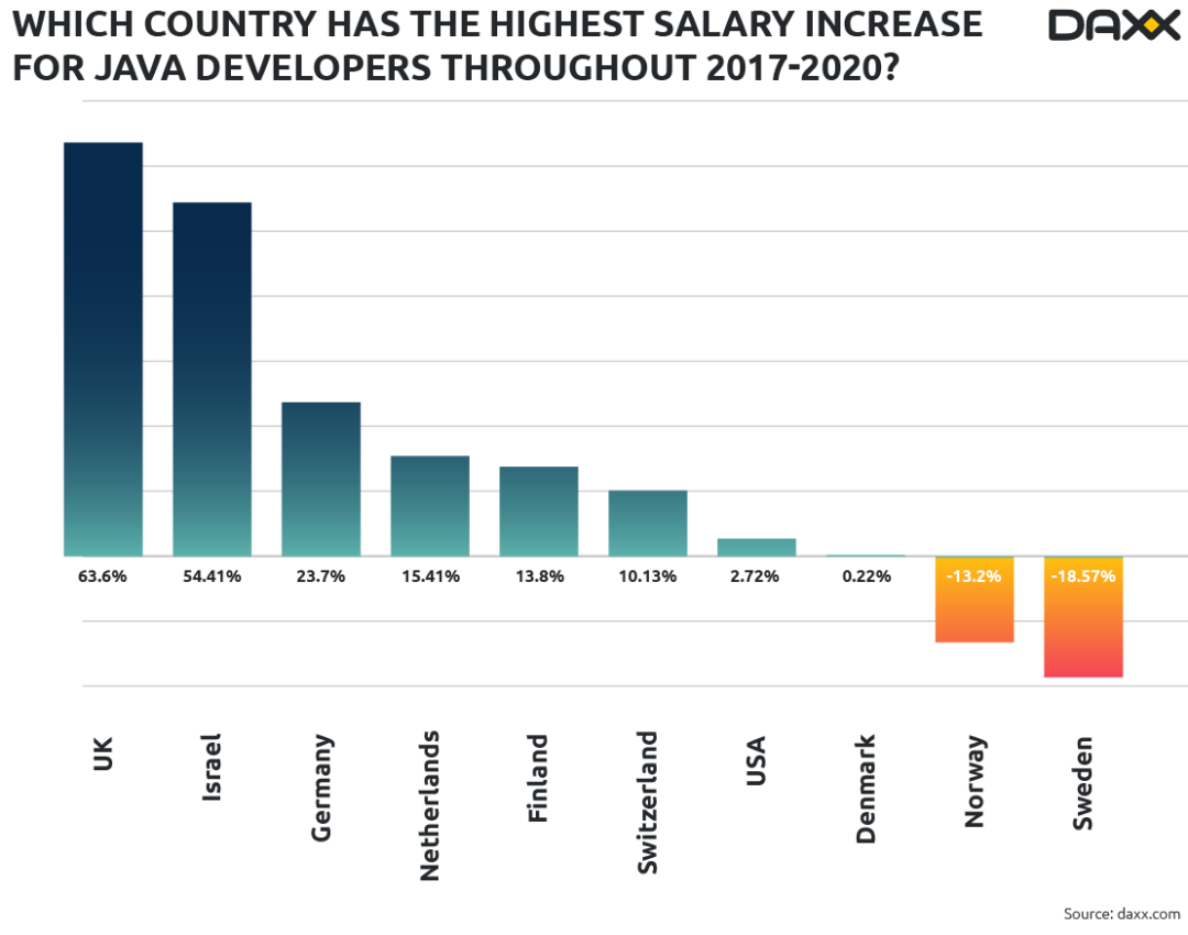 2017年到2020年,不同语言背景的开发者薪酬上涨情况各不相同。拿Java开发者来说,他们的收入增长在以色列仅次于美国,增长了54%。在德国、英国和荷兰,软件开发者的薪资也有明显提升,增长比例介于23%到10%之间。