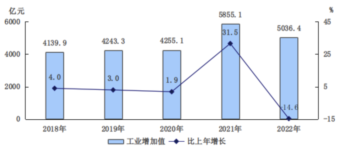 全年工业增加值达到了5036.4亿元,但若按固定价格计算,与去年相比下降了14.6%,下降幅度明显。传统制造业的转型进展不快,市场需求也在持续减少,这些可能是工业产值减少的原因。这一变化可能会对该地区的就业和税收收入产生直接影响。