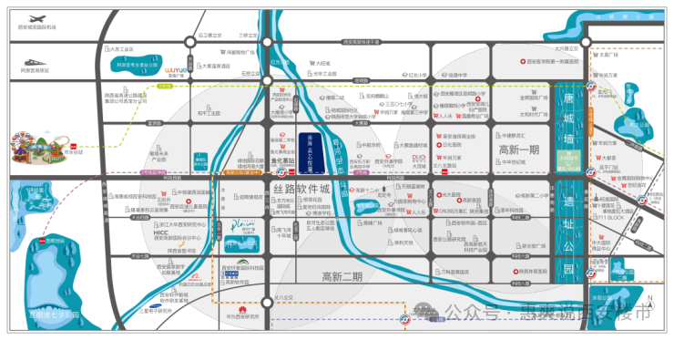 该项目坐落在皂河生态公园的东边,横贯高新区的南北两侧。在空闲时间,人们可以悠闲地漫步其间,尽情呼吸清新的自然空气。此外,它靠近唐城墙遗址公园以及西安人才公园等城市生态重要区域,周边环境十分宜人舒适。