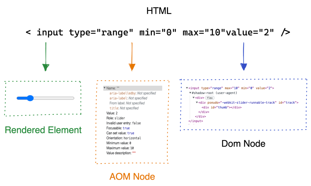 浏览器引擎利用HTML来生成用户界面,而ATs设备也借助HTML来形成可访问性树。因此,带有语义的HTML对于保障Web应用的无障碍性显得尤为重要。原生HTML标签本身就包含了构建可访问性树所需的信息,比如滑动输入框可以被ATs设备精确展示,即便没有添加WAI-ARIA属性。有时,我们得用屏幕阅读器,只能看到那些标签,却弄不清哪些部分能点。