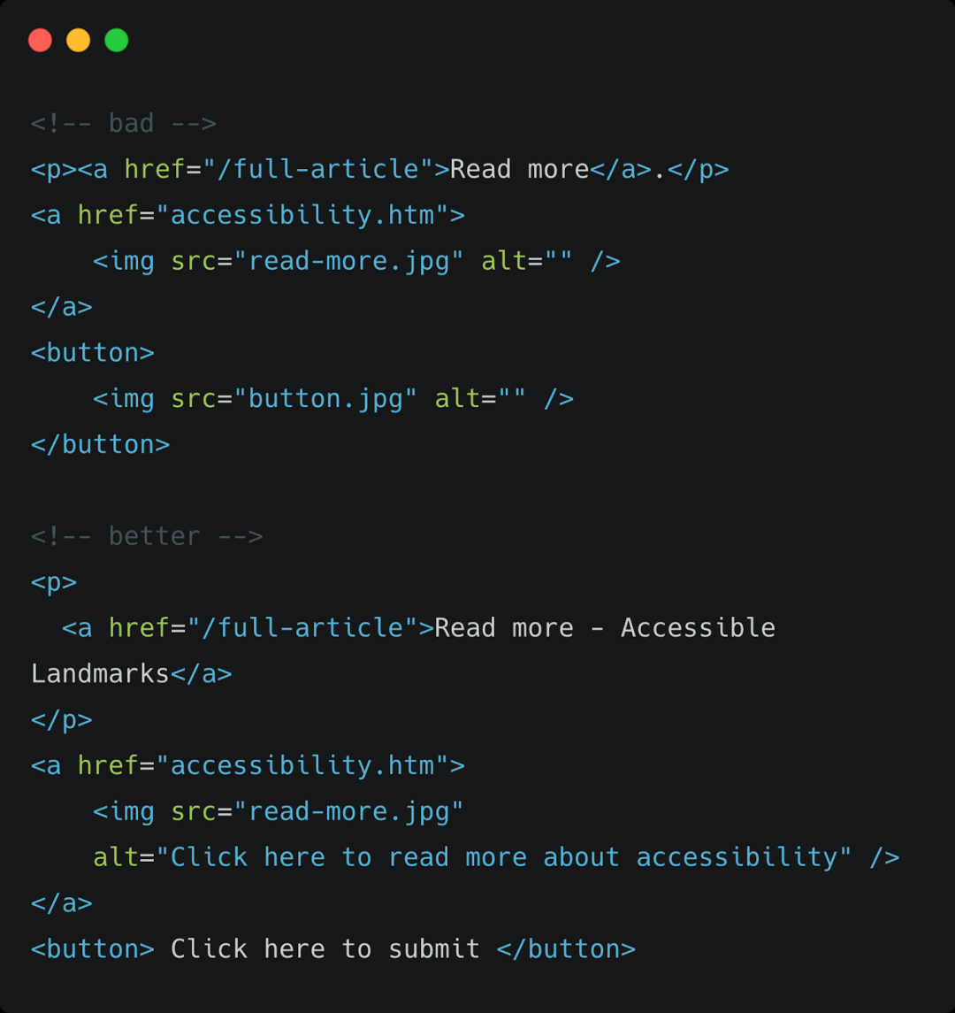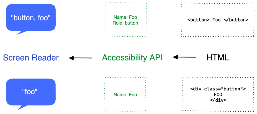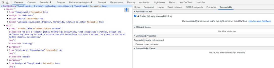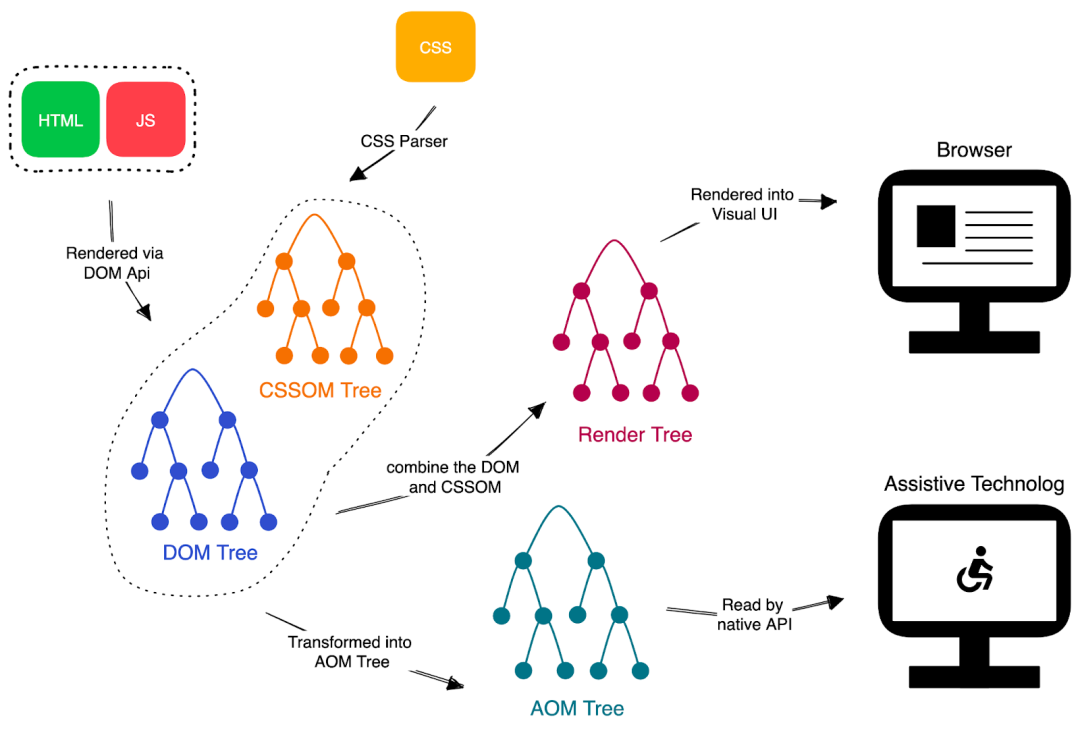 残障人士需要借助辅助工具,例如屏幕阅读器来阅读网页。然而,一些问题影响了他们的使用感受。例如,标签的alt属性对于辅助设备获取图片信息至关重要。如果标签只包含图像或图文,辅助设备的使用者将难以了解交互元素的用途。此外,在网页上设置lang属性,有助于辅助设备识别出当前的语言。同时,AT设备能接触到每一个DOM元素,这些元素在可访问树中都有相应的无障碍实体对应。